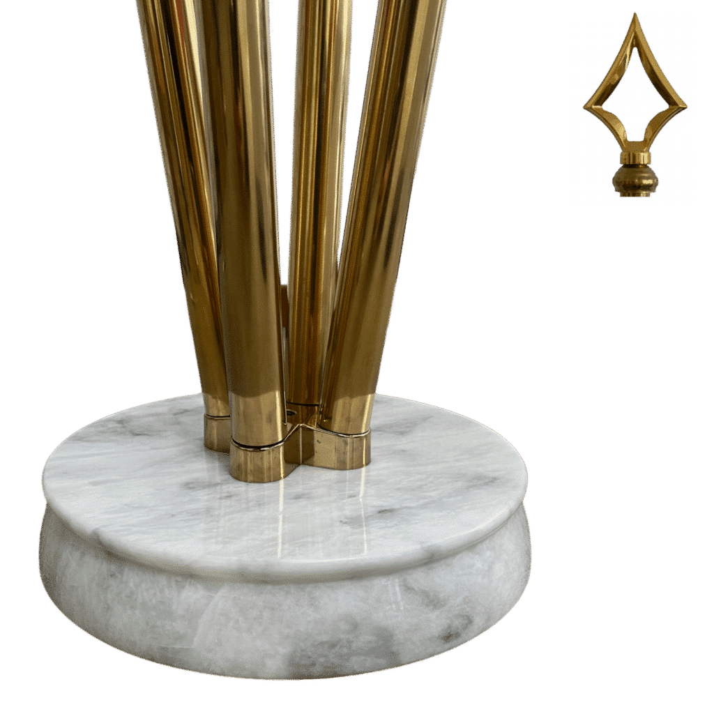 Le finiture di alta gamma in acciaio inox, marmo o legno laccato aggiungono un tocco di prestigio e raffinatezza a qualsiasi interno. La struttura robusta garantisce un’eccellente stabilità, anche in presenza di più aste per bandiere, pur mantenendo un’estetica elegante e discreta.