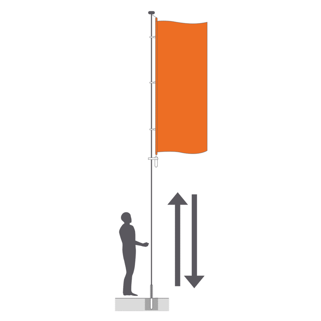 Fissaggio dell’asta della bandiera: l’asta della bandiera è fissata a una piastra inclinabile incastonata in un blocco di cemento. La bandiera viene cambiata utilizzando la drizza interna con sistema antifurto.