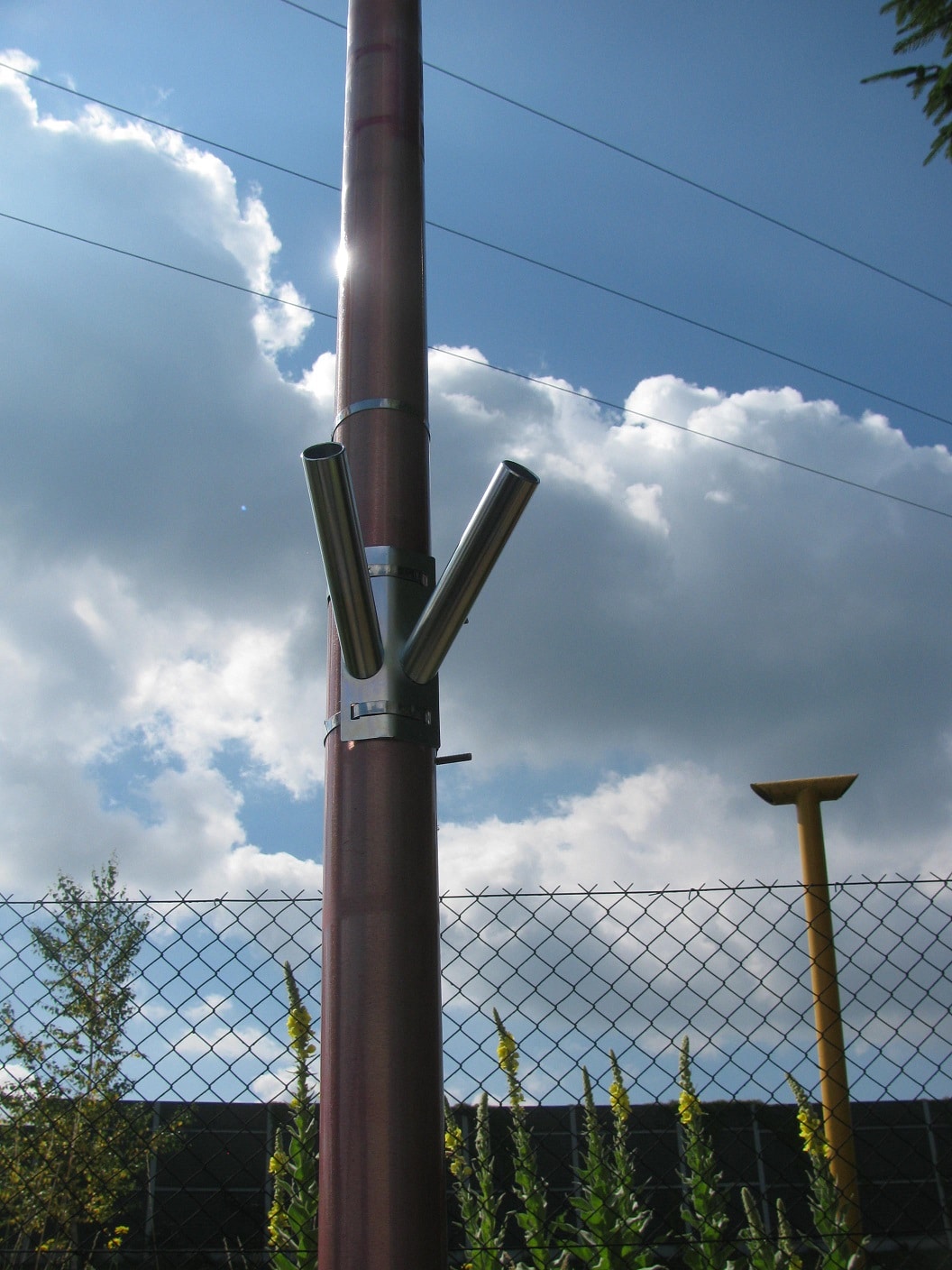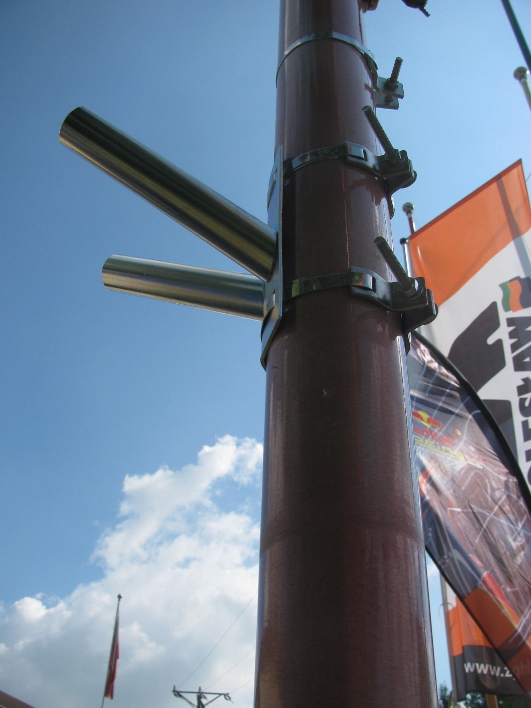 - Fissa il supporto per bandiera al palo o al lampione, stringi i collari con i morsetti inseriti nelle staffe di montaggio e stringi i dadi con una chiave. Dopo aver montato il supporto per bandiera, le aste vengono fissate ai supporti e fissate con delle viti.